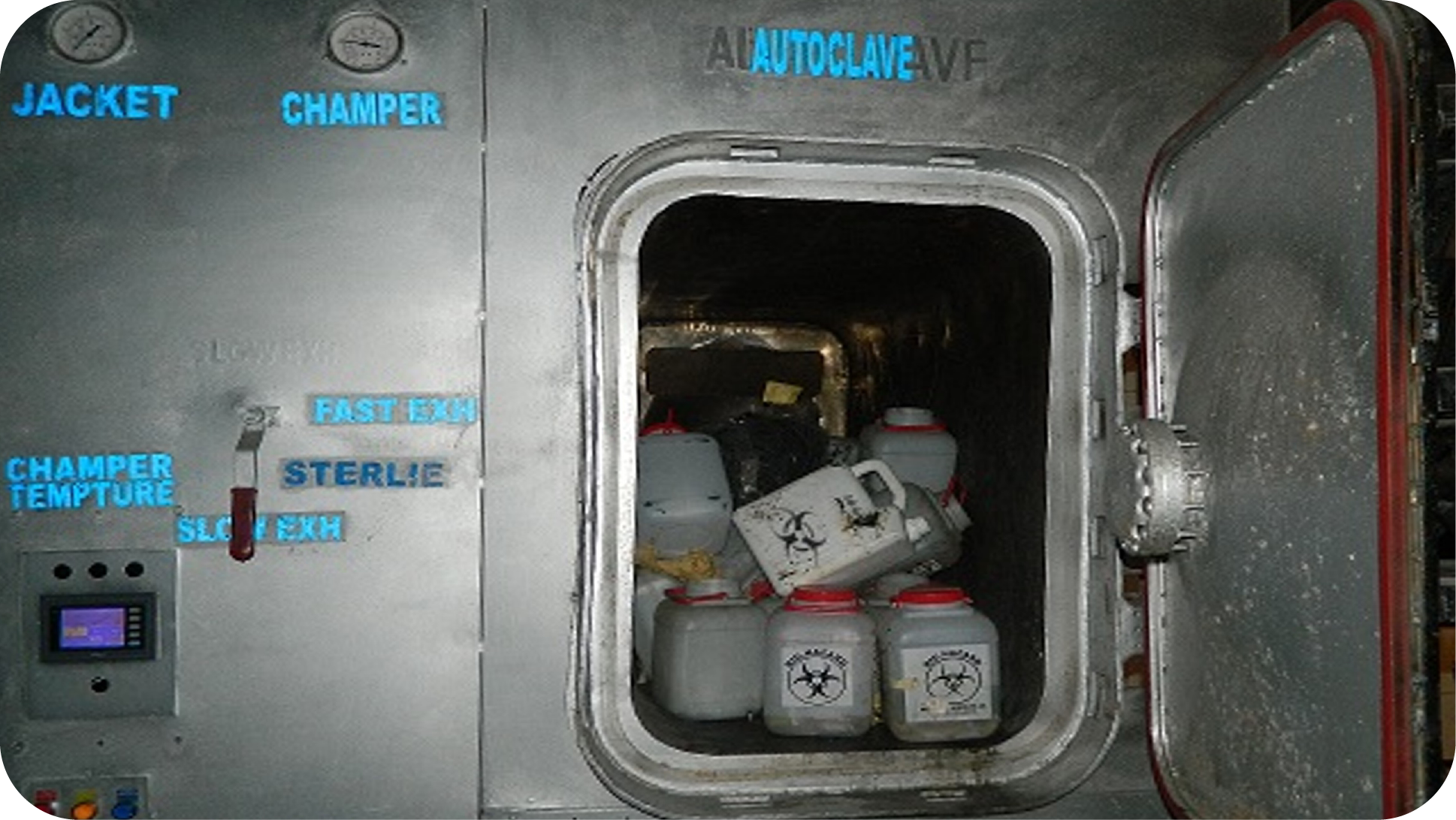 The non incinerable bio medical wastes, collected in red bags and Puncture Proof Containers (PPC’s) are subjected to steam sterilization using vacuum autoclave. In this process, the bio medical wastes will be completely disinfected and decontaminated. The vacuum autoclave will reach a temperature of 121 degree C and a pressure of 1.5 Kg/cm2.